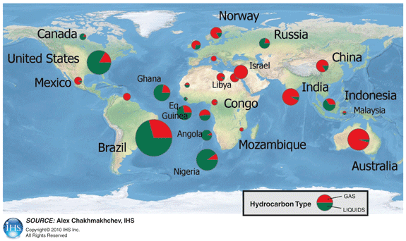 Looking at the distribution of deepwater reserve additions, the world leader by far over the past five years was Brazil, followed by the U.S. Gulf, Australia, India, Angola, Ghana, Nigeria and Israel. The Atlantic Coast margin–spanning from Nigeria, Angola, Equatorial Guinea, Ghana, the deepwater Gulf of Mexico and Brazil–tends to be more liquids prone than gas prone. On the other hand, large reserves discovered offshore Australia, India and Israel are predominately gas.