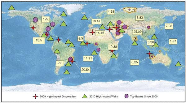 Looking at projections through the rest of this year, a mixture of independents, supermajors and national oil companies are expected to drill “high-impact” wells that represent a new play or basin, or have a prospect size of 100 million barrels of oil equivalent or larger. Eastern Canada, Greenland, Falklands and East Africa are among the international areas where independents are expected to make high-impact discoveries in 2010.