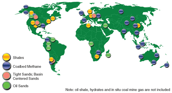 Figure 3 shows worldwide locations of gas shale, oil shale, coalbed methane and tight sands prospective areas. From a geologic perspective, it appears the United States and Canada are unique with respect to their concentrations of resource plays. The paleogeographic history and stratigraphic age of the North American continent mean CBM, tight gas sands, and oil and gas shales co-exist in relative close proximity to one another. In most regions around the world, one type or another is found. For example, while coalbed methane is prevalent in Australia, shale is a dominant geologic feature in Latin America. Only Europe and perhaps South Africa so far have the potential for two types–CBM and shale–close to each other.
