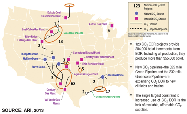 The main barrier to growth in oil production from CO2 EOR is insufficient supplies of affordable CO2. The growth of carbon dioxide flooding in West Texas, Wyoming and the Gulf Coast is constrained by supply, and CO2 from current sources is fully committed. While a number of efforts have been under way to alleviate this supply shortage, new CO2 supplies are absorbed quickly.
