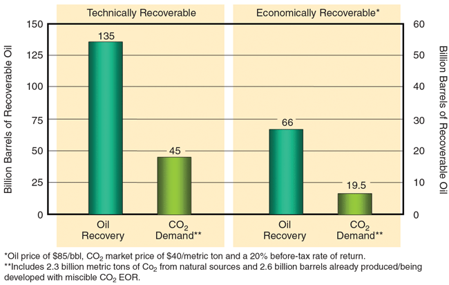 The U.S. Department of Energy’s National Energy Technology Laboratory concludes that “next-generation” CO2 EOR can provide 135 billion barrels of incremental technically recoverable oil in the United States, with about half of that total (66 billion barrels) economically recoverable at a West Texas Intermediate oil price of $85 a barrel, a CO2 market price of $40 a metric ton, and a 20 percent return on investment before tax.