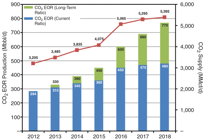 DOE/NETL has developed a growth forecast for near-term sources of CO2 supply based on information on current sources for EOR, estimated remaining CO2 reserves from natural sources, and CO2 supply projects that have become operational recently, are under construction, or are in the final stages of design and financing. Anticipated growth in injectant supply between 2012 and 2018 provides a reasonable basis for estimating near-term growth in CO2 EOR production, based on assumed utilization ratios for CO2 purchased/acquired per incremental barrel of oil produced from EOR.