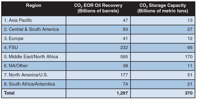 Updating this work, and assuming state-of-the-art technology, the largest discovered fields in these basins (those greater than 50 million barrels of original oil in place) alone have the potential to produce 470 billion barrels of additional oil, and store 140 billion metric tons of CO2. If “next generation” CO2 EOR technology could be applied successfully to these and smaller fields, along with fields that are yet to be discovered, the worldwide application of CO2 EOR could recover nearly 1.3 trillion additional barrels, with associated CO2 storage of 370 billion metric tons (Table 1).