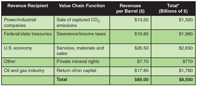 As illustrated in Table 2, the U.S. economy would be a large beneficiary, receiving $2.65 trillion in revenues. Federal and state treasuries would receive total revenues of $1.98 trillion, while electric power and other industrial companies would receive $1.32 trillion. For its part, the U.S. oil and gas industry would receive $18.50/bbl for return of and return on the capital investment, while private mineral owners would receive $7.70/bbl.