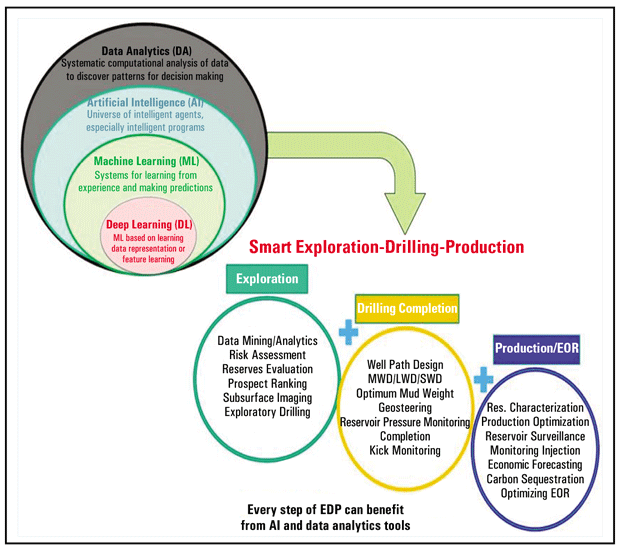 Figure 1 lists domains across exploration, drilling and production where AI and data analytics can improve processes and reduce costs. During exploration, AI-DA can help companies interpret subsurface images, evaluate potential reserves, rank prospects, assess risks and pinpoint the best exploratory drilling locations.