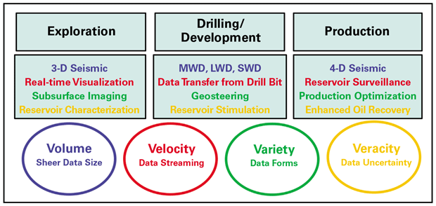 Figure 2 color-codes several oil and gas areas to highlight the V that is most important for data from that space. In the exploration space, seismic acquisition involves huge volumes of data, represented by blue. Visualizing data in real-time necessitates a high velocity for data analysis, represented by red. Subsurface imaging integrates several different forms of data, bringing variety (green) to the forefront. And reservoir characterization involves managing uncertainty and therefore considering the veracity (gold) of various data sources.