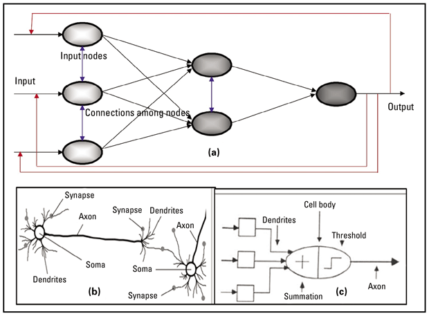 The nodes within each structure resemble the biological neurons in the human brain. To illustrate this similarity, Figure 3b shows a biological neuron’s components. The cell body (soma) receives messages from other neurons through dendrites and sends messages to those neurons using axons. To reach their destination, these messages must travel across synapses linking the neuron to other cells.