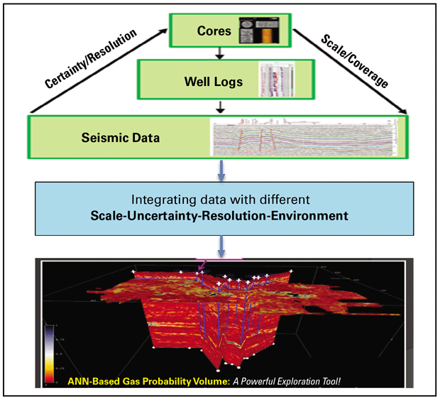 As a case in point, some colleagues and I used an artificial neural network to integrate data from the Grand Bay Field in the Gulf of Mexico and create the gas probability map shown below the pyramid. To do so, the ANN weighed the significance of different seismic attributes and log data based on the training data information. Had we tried to create the map using traditional methods, it would have taken much longer with less accurate results.