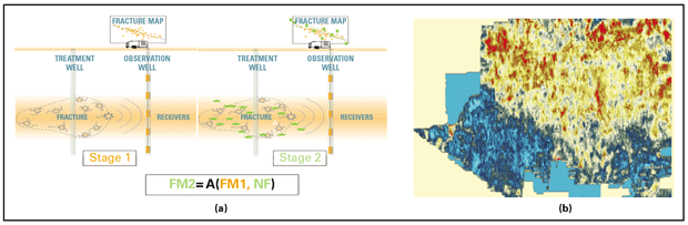 An application of this approach for updating the fracture system from micro seismic data before and after different intervals of CO2 injection is shown in Figure 5a. In this case, the slope of the fracture grouping at the top of “stage 1” of injection gets steeper at the second stage of injection, a change that may indicate increased risk of induced seismicity from the new injection. The stage 2 fracture map (FM2) is calculated “recursively,” using a nonlinear operator (A), based on the stage 1 fracture map (FM1) and the new fractures (NF).