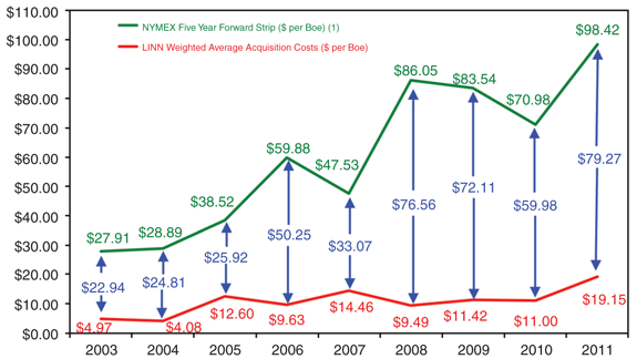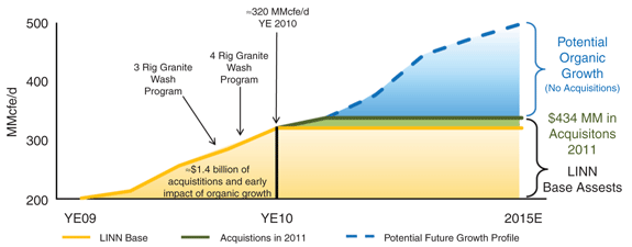 Ellis points out that in 2010, LINN replaced 321 percent of its reserves through drilling at an average finding cost of $0.79 an Mcfe. Including acquisitions, the company replaced more than 1,000 percent of its reserves at $1.69/Mcfe.