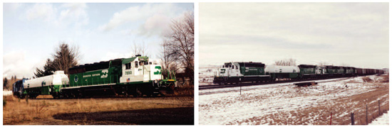 Using a dual-fuel, 16-cylinder turbocharged engine, the Burlington Northern 7890 shown at left was the first demonstration of a direct injection natural gas locomotive. The image at right shows the Burlington Northern 7890 and 7149 dual-fuel natural gas tandem in service hauling coal. Coupled to a 20,000-gallon LNG tender car, the locomotive pair achieves full power and has a range of more than 800 miles between refueling stops. Photos courtesy of Energy Conversions Inc.