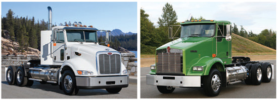 These Peterbilt (left) and Kenworth (right) trucks are powered by LNG. Utilizing technology such as high-pressure direct injection fuel systems allows over-the-road trucks to consume 5 percent diesel and 95 percent LNG for improved emissions performance without losing power, torque or efficiency.Photos courtesy of Peterbilt and Kenworth.