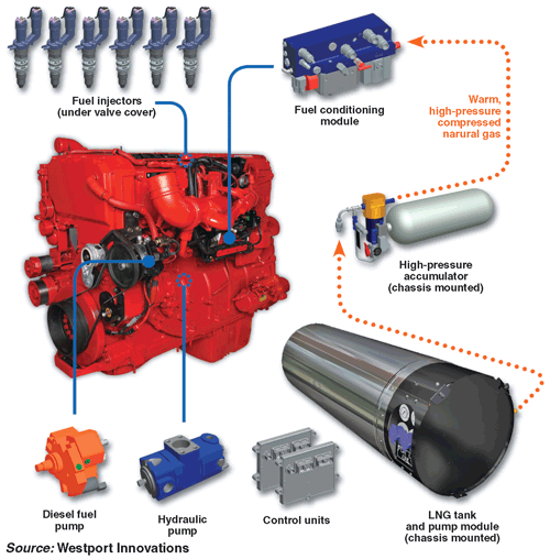 Figure 1 shows a Westport Innovations LNG fuel system for a diesel engine. Of particular interest with this dual-fuel engine option is the capability to allow a significant amount of ethane to remain in the fuel. This could solve some ethane disposal issues for wet gas producers.