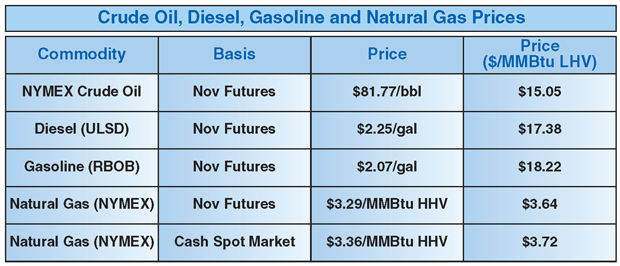 U.S. natural gas prices lingered around $3.00-$4.00 an MMBtu on the New York Mercantile Exchange much of this fall, despite relatively strong crude oil prices in the range of $80.00-$85.00 a barrel. This divergence of pricing between petroleum-based products and natural gas is astounding. Table 1 indicates that natural gas is trading at only 20-25 percent of diesel and gasoline prices on a lower heating value basis.