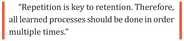 Repetition is key to retention. Therefore, all learned processes should be performed in order multiple times during the training week.