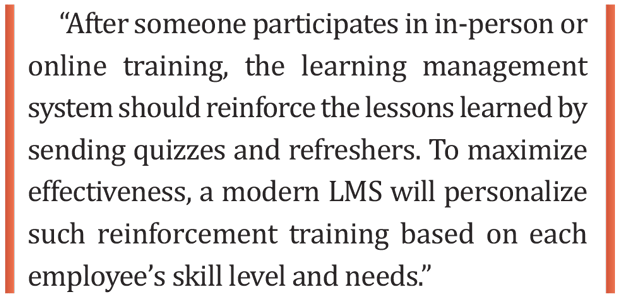 After someone completes in-person or online training, the LMS should reinforce the lessons learned through quizzes and refreshers. To maximize effectiveness, a modern LMS will personalize such reinforcement training based on each employee’s skill level and needs. When an employee logs into the LMS, it flags high-priority topics.