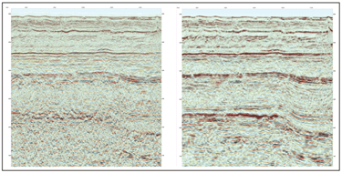 For instance, Spectrum’s multiclient 2-D library consists of more than 22,500 kilometers of seismic data with record lengths of 12 seconds two-way time. The data set consists of four regional surveys acquired in 1975, 1993, 2000 and 2002, and all the data either have been reprocessed or are now being reprocessed using advanced prestack time migration algorithms to produce a data set that is fully compliant for amplitude-variation-with-offset (AVO) analysis. As an example, Figure 1 shows the original 2-D data at left and the reprocessed prestack time migrated data at right.