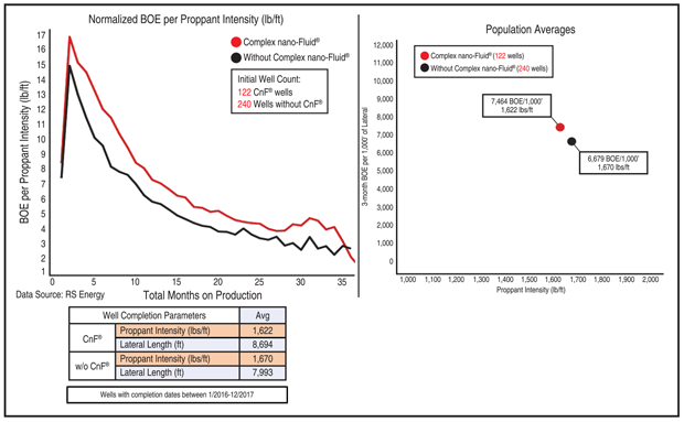 “The wells were completed around the same time, so they had similar lateral lengths and proppant intensities,” Hill says. “The ones treated with reservoir-centric blends had an average cumulative three-month production of 7,464 boe for every 1,000 feet of lateral, while the others produced 6,679 boe for every 1,000 feet of lateral despite using 50 pounds more proppant per foot, according to data from RS Energy.”