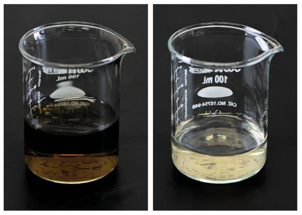 This before-and-after comparison shows that Solugen’s bio-chelant helps remove iron sulfide by sequestering the Fe3+ irons. The chelant biodegrades when exposed to the natural environment and can be produced much closer to oil field activity than traditional alternatives, Solugen says, noting that this reduces the costs and environmental impacts associated with shipping.