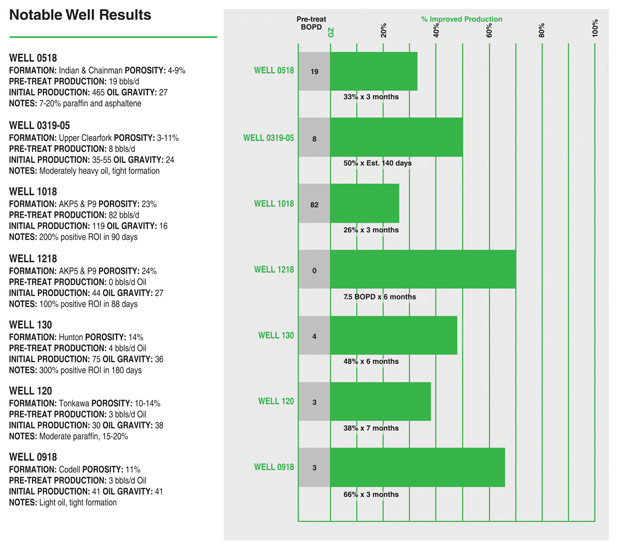 In fact, Gentry says operators have been able to use produced water from a treated well to increase production from a second well. He cites multiple applications in Texas where clients have re-applied a single dose of product either through huff-and-puff methods or water injectors.