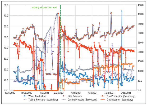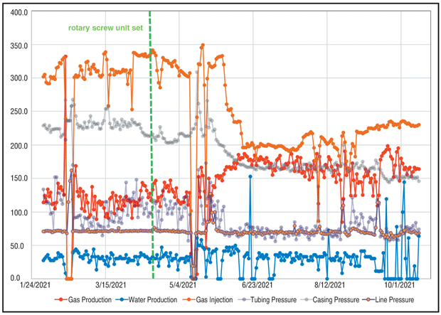 After installing the rotary screw compressor, the suction controller was set at 30 psig and maintained at that level constantly. The pressure differential between a 69 psig line and 30 psig suction pressure made a positive performance enhancement. Comparing the well’s performance from Jan. 1 with Oct. 13, 2021 (before and after the rotary screw was set) shows decreased casing pressure (~25%), decreased gas injection volumes (~25%), and increased gas production rates (~27%) without compressor downtime.