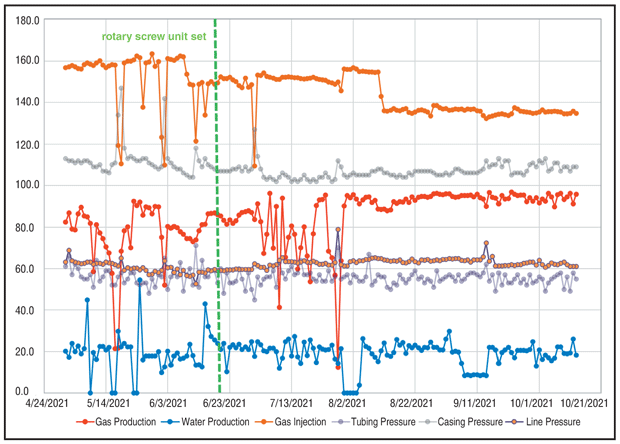 The 108-mm rotary screw compressor was installed on June 30, 2021. Three months prior to compressor change out, the smaller reciprocating compressors were shutting down because of low suction pressure conditions. The recips averaged 71 Mcf/d gas production at 155 Mcf/d gas injection and 110 psig casing pressure.