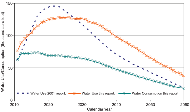 Despite increasing drilling activity, a study conducted in 2011 by the Bureau of Economic Geology at the University of Texas and updated in February this year projects increased use of brackish and produced water in place of freshwater along with flat-to-declining freshwater consumption by oil and gas operators. Graph courtesy of Pioneer Natural Resources