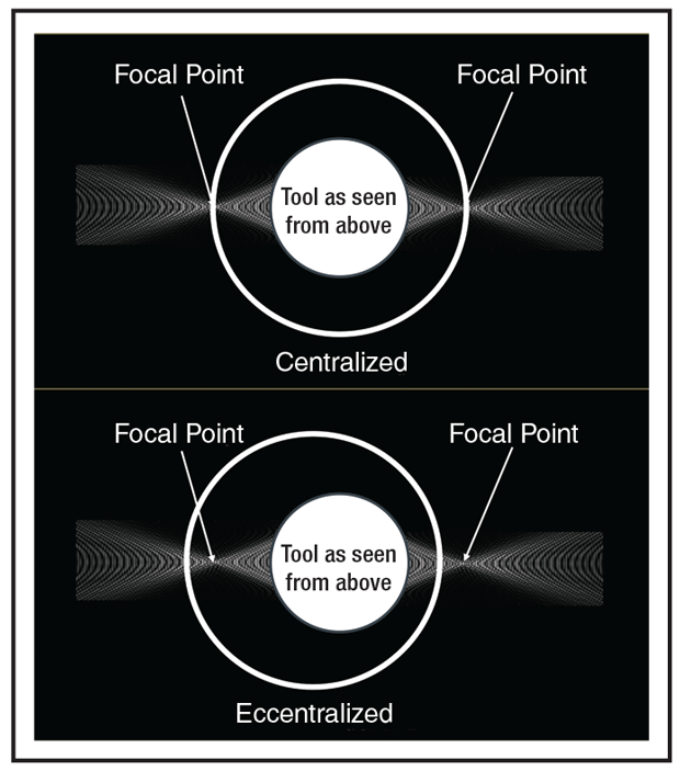 But when pronounced eccentralization occurs, as shown in the bottom panel, the beam no longer focuses on the casing’s interior surface. Where the tool is closer to the casing wall, the beam hits the wall before it is done focusing, and the reflections will not come from a single point. On the tool’s opposite side, where the tool is farther away from the casing, the opposite situation occurs and the beam will diverge from the focal point when reflected. In both cases, the apparent dimensions of features will be distorted in the circumferential direction, but not in the axial direction.