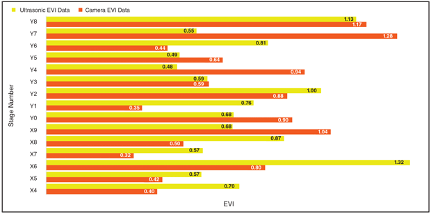 Figure 3 shows the EVIs for each stage in Well 1. The results are mixed, with some stages, such as Y8, Y3, Y2 and X5, producing similar EVI values based on both camera and ultrasound measurements, but others, such as Y7, Y4, X6 and Y1, showing notable differences between the sensors.