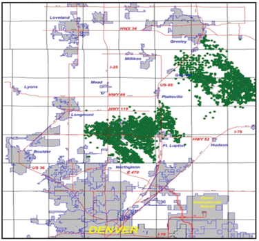 The Terry is one of the shallowest producing formations in the D-J Basin at depths between 4,300 and 5,000 feet. Hydrocarbons were discovered in the Terry in 1971 and the reservoir originally produced from three fields in Weld and Adam counties: Spindle, Hambert and Aristocrat. Figure 1 is a cultural map showing the location of Terry vertically completed wells (green dots). The formation’s productive extent begins roughly 15 miles north of Denver and extends to the northeast, terminating beneath Greeley, Co.