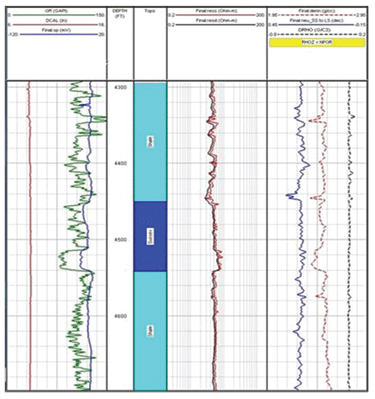 In addition, the core data suggest the presence of chlorite (3 percent of matrix) as pore lining clay, which contributes to reduced apparent resistivity log values. However, continuous chlorite clay coating helps to preserve intergranular porosity. Therefore, it is imperative to correct the apparent resistivity log for the presence of fine- and very fine-grained sandstone, illite, smectite and chlorite clays. In the absence of exhaustive core analysis data to obtain such corrections, the petrophysical model was constructed to identify and quantify the LRLC formation pay.