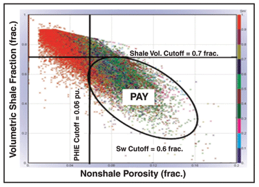 Identifying proper petrophysical cutoff parameters was necessary to determine producible hydrocarbon volume and establish an economical reserve estimate. Since appropriate production data were not available, a graphical approach was used to determine the cutoff values. Figure 4 shows a plot between nonshale porosity and volumetric shale fraction with different colors representing water saturation values in the Terry formation. From this figure, petrophysical cutoffs of 70, 6 and 60 percent were obtained for shale volume, nonshale porosity and water saturation, respectively, to identify maximum possible pay from which hydrocarbons could be produced economically.