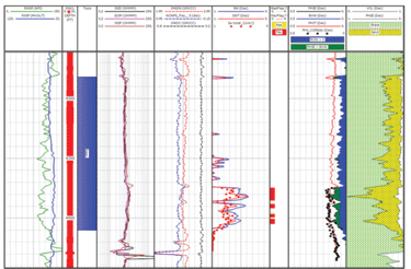 Figure 6 shows the petrophysical analysis with available core measurements for a well in the Spindle Field west of the Pioneer area. Track 4 shows a good match between the nonshale water saturation values calculated from logs and core-measured values. Track 5 shows the nonshale porosity, total porosity calculated from logs, and core-measured total porosity values. Again, there is a good match between log-calculated and core-measured total porosity values.
