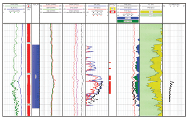 Figure 5 shows the petrophysical analysis results with available core measurements for a well in the Latham Field, two townships north of the Pioneer area. Track 1 shows gamma ray (green) and SP (blue). Track 2 shows deep (purple), medium (fuchsia) and shallow (red) apparent resistivity logs. Track 3 shows neutron (blue), bulk density (red) and density correction (black) logs. Track 4 shows calculated nonshale (blue), total water saturation (red) and measured total water saturation (red dots). Track 5 shows computed fluid fraction in pores, total porosity calculated from logs (red), and core-measured total porosity (black dots), while track 6 shows estimated lithology. Track 4 indicates a good match between the nonshale water saturation values calculated from logs and core-measured water saturation values, while track 5 confirms a good match between log-derived and core-derived total porosity measurements.
