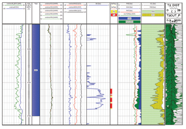 Production data from a well completed in the Terry formation in the Pioneer area were used to verify the petrophysical model. Figure 7 shows the Terry petrophysical analysis. The apparent resistivity log in track 2 shows a low resistivity contrast between the Terry and Pierre Shale. Furthermore, the NMR T2 distribution across the Terry (track 7) indicates larger pore sizes and possible hydrocarbons compared with the Pierre response. The average nonshale water saturation, average nonshale porosity, and net pay in the Terry are 35 percent, 12 percent and 25 feet, respectively. Total NMR porosity (green in track 5) is in good agreement with calculated total porosity.