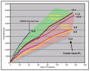 Figure 8 shows cumulative hydrocarbon production from seven wells in the Pioneer area. Six of the wells were completed in Codell and Niobrara formations, while the other well (navy blue curve) was completed simultaneously in the Terry. The numbers displayed are mean total porosity across the Codell. The well with the Terry completion produced 4,600 barrels of oil equivalent at the end of 43 days, or 1.4 times more than the 3,200 boe that would have been expected if the well had been completed in only the Codell and Niobrara formations.