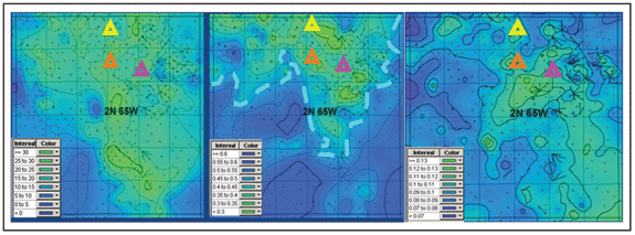 The petrophysical model was built to explicitly determine reservoir quality and generate the attribute maps. As in all petrophysical analysis, the three basic attributes determined were shale volume, porosity and water saturation.