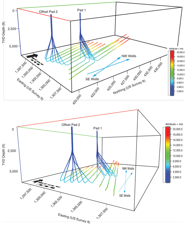 Optimizing the horizontal spacing between wells in the lease area makes it possible to develop two formations from the same surface location. The horizontal spacing was roughly 740 feet for all the wells at the same TVD, and the two Upper Devonian wells (1J and 1I) were planned between the six Middle Devonian wells (1A, 1B, 1C, 1D, 1E and 1F) for better reservoir drainage.