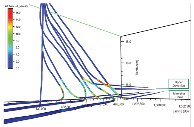 Figure 2 shows two views of Pad 1 and Pad 2 well trajectories. Pad 1 had a combination of southeast- and northwest-oriented horizontal sections, while Pad 2 had only northwest wells. The color code represents measured depth. Figure 3 shows 2-D and 3-D views of Pad 1 well trajectories developed for the 8¾-inch curve section with planned BURs between 8 and 10 degrees/100 feet and horizontal sections in the Upper Devonian (Rhinestreet and Burkett shales) as well as the Middle Devonian (Marcellus). BURs were achieved up to 16 degrees/100 feet. The length of the 8¾-inch section ranged from 4,400 to 14,700 feet. The color code represents dogleg severity (DLS).