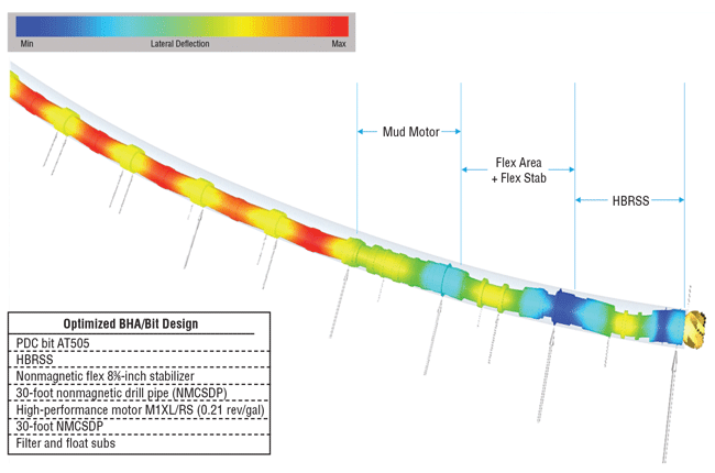 Figure 5 shows the optimized PDC bit/BHA matching design utilized on Pad 1. The entire BHA underwent finite element analysis to check BUR capabilities and bending moment limits, in addition to static and dynamic scrutiny to ensure performance. Besides high dogleg capabilities, HBRSS technology is able to precisely drill vertical, curve, and lateral sections in one run. Automated, closed-loop steering control allows continuous steering for critical wellbore placement in pad drilling with limited spacing.