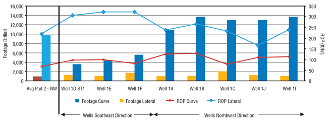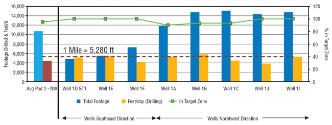 Four of the eight Pad 1 wells achieved footage rates up to one mile a day (wells 1E, 1A, 1B and 1I), and five of the eight (wells 1DST1, 1E, 1F, 1J and 1I) remained in the target zone 100 percent of the time. Compared with the Pad 2 wells, Pad 1 wells recorded a 7 percent increase in ROP, a 3 percent increase in total footage drilled, a 2 percent increase in in-zone time, and a 9 percent increase in the amount of footage drilled per day.