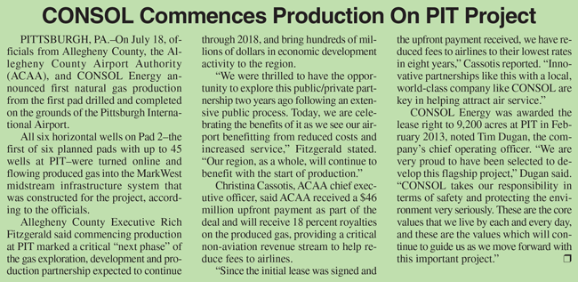 CANONSBURG, PA.–More than 240 flights carrying some 22,000 passengers move through the runways and concourses of the Pittsburgh International Airport every day. But below the PIT complex are the prolific Marcellus and Upper Devonian shales, and potentially, the deep dry Utica shales that underlie western Pennsylvania. In 2013, CONSOL Energy entered a partnership with the Allegheny County Airport Authority (ACAA) to develop natural gas reserves beneath 9,263 acres on PIT grounds. A dry Utica test well has been approved by federal, state and local authorities, and will replace a Marcellus well in the 47-well PIT development plan.