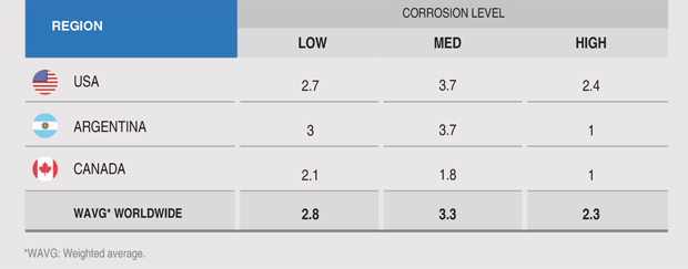Applying the same criteria, and grouping all regions’ data, the global integration of the results tends to mimic that of the U.S. experience. In general, increased run life was attained compared with standard steel rods under medium- and low-corrosion conditions. Results obtained in the different regions versus standard rod for each of the corrosion levels are shown in Figure 2. The results for low and medium corrosion levels were similar for all regions. In average, previous run life in this environment was almost duplicated.