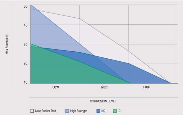 As corrosion increases to a mid-level, the widest separation is detected between the new sucker rod grade and D, KD and HS4138 rod grades. This is because it at this level of loading and corrosion where the previously installed rod grades suffered the most from corrosion fatigue mechanisms. The premium rods offer better performance with a higher life span.