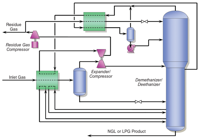 - Supplemental rectification with compression (SRC™), which is an enhancement over both SCORE and GSP. The technology includes a small reflux compressor to assist with condensing and subcooling a side draw vapor stream that is then used as reflux in the distillation column. SRC is considered a flexible gas processing technology capable of recovering almost all ethane in ethane recovery mode or operating in full ethane rejection without hurting propane recovery.