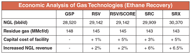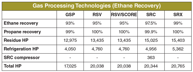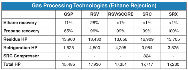 Tables 1 and 2 compare ethane and propane recoveries for each technology, as well as the horsepower requirements for each process. The results in Table 1 show that RSV, RSV/SCORE, SRC and SRX all are able to achieve higher ethane recoveries than GSP, satisfying Apache’s targeted 95 percent ethane recovery requirement. All options also satisfied the compression horsepower requirements. Even though GSP, RSV and RSV/SCORE utilize less compression than SRC or SRX, the fuel savings are considered insignificant when evaluating the technology options according to overall plant operating costs.