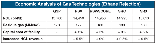 Results show the incremental NGL production increase for each technology compared with a GSP. The GSP and RSV designs in this study, while providing the lowest capital investment, were not considered viable because of their inability to maintain the desired propane recoveries in ethane rejection mode. The RSV/SCORE provides recoveries similar to an SRC or SRX design, but lacks those technologies’ operating flexibility. Unlike SRC or SRX, which offer on line switching, the RSV/SCORE requires shutting in the inlet gas to switch between recovery and rejection modes.