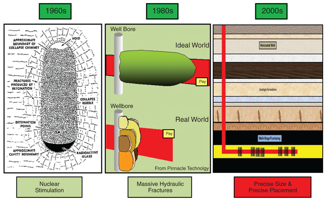 Today, the evolution of lateral and horizontal drilling technology is beginning to allow the development of unconventional resources through the placement of smaller well bores into exactly the area and location required for optimum production. Figure 1 illustrates the evolution of the technology over the past four decades, with horizontal drilling and multistage fracturing combining to allow operators to stimulate substantially more reservoir volume yet achieve ever-more precise placement and treatment size.