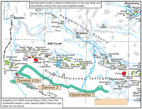 The company’s target in the Lower Saxony region consists of 15,888 contiguous acres known as the Aschen concession (Figure 1). Realm Energy intends to target primarily the two organically rich shale oil and gas resource plays on Aschen: the Lower Cretaceous Wealden Shale and the Lower Jurassic Posidonia Shale. Both shales appear to be mature for oil and/or gas, and also may exhibit desirable overpressures. In addition, the company will focus on conventional zones that it believes are underappraised in oil discovery areas (the Diepholz and Bollermoor oil discoveries), as well as the Aschen sweet gas field.