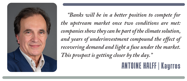 Which is not to say that bank lending is done for good. “Not at all,” Halff responds. “Banks will be in a better position to compete for the upstream market once two conditions are met: companies show they can be part of the climate solution, and years of underinvestment compound the effect of recovering demand and light a fuse under the market. This prospect is getting closer by the day.”